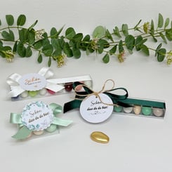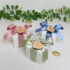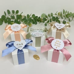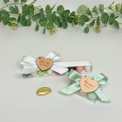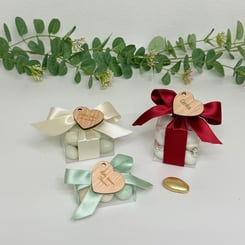 Inkl.: Personalisierte Kärtchen mit Wunschtext bedruckt, mit Schokomandeln gefüllt. Für die gewünschte Farbe des Geschenkbandes und Schokomandeln, kontaktieren Sie bitte uns nach der Bestellung.