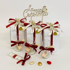 Inkl.: Schachtel, Bomboniera Kärtchen mit Name und Datum bedruckt, Tüll mit 5 Mandeln gefüllt.