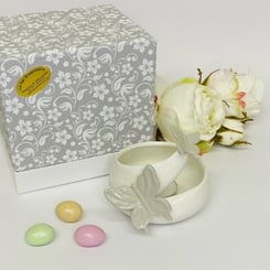 Inkl.: Schachtel Bomboniera, Bomboniera Kärtchen mit Name und Datum bedruckt, Säckchen oder Tülle mit 5 Mandeln gefüllt. Bandfarben (auf Anfrage) möglich.