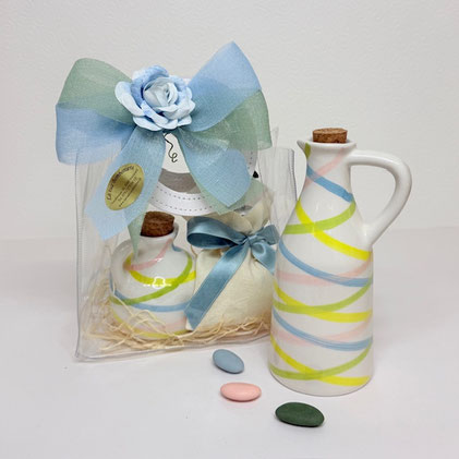 Inkl.: Shopper mit Handgriff aus PVC, Ausgiesser, Bomboniera Kärtchen mit Namen und Datum bedruckt, Jutesack in beige mit 5 Mandeln gefüllt. Bandfarben auf Anfrage möglich.