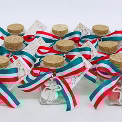 Inkl.: Bomboniera Kärtchen mit Name und Datum bedruckt, mit 9 Mandeln gefüllt. Bandfarben (auf Anfrage) möglich. Mandeln und Tenerezze mit diversen Geschmäcken (auf Anfragen) möglich.