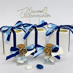 Inkl.: Bomboniera Kärtchen mit Name und Datum bedruckt, mit 7 Mandeln gefüllt. Bandfarben (auf Anfrage) möglich. Mandeln und Tenerezze mit diversen Geschmäcken (auf Anfragen) möglich.