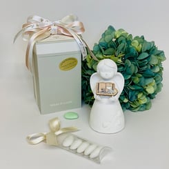 Inkl.: Schachtel, Bomboniera Kärtchen mit Name(n), Datum und Anlass bedruckt, Tüll mit 5 Zuckermandeln gefüllt.