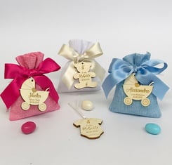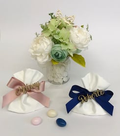Inkl.: Bomboniera Kärtchen mit Name und Datum bedruckt, mit 5 Mandeln gefüllt. Bandfarben und Mandeln (auf Anfrage) möglich.