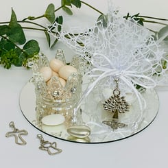 Inkl.: Bomboniera Kärtchen mit Name und Datum bedruckt, PVC mit 5 Mandeln gefüllt.