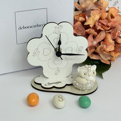 DC24144 Bomboniera Kleeblatt-Uhr aus Holz & Eule aus Resin H. 11.5x7x10.5cm.