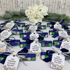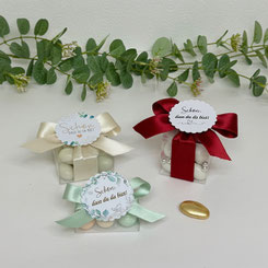 Inkl.: Personalisierte Kärtchen mit Wunschtext bedruckt, mit Schokomandeln gefüllt. Für die gewünschte Farbe des Geschenkbandes und Schokomandeln, kontaktieren Sie bitte uns nach der Bestellung.