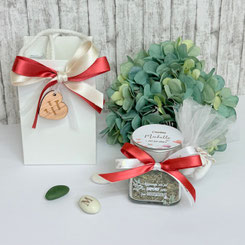 Inkl.: personalisierte Tag mit Namen und Datum bedruckt (nach Thema), Tüll mit 5 Mandeln oder Schokomandeln mit diversen Geschmäckern gefüllt. Bandfarben (auf Anfrage) möglich.