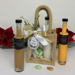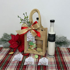 Inkl.: Jutetasche, Personalisierte Tags, Säckchen mit 100g Schokomandeln mit diversen Geschmäckern gefüllt.